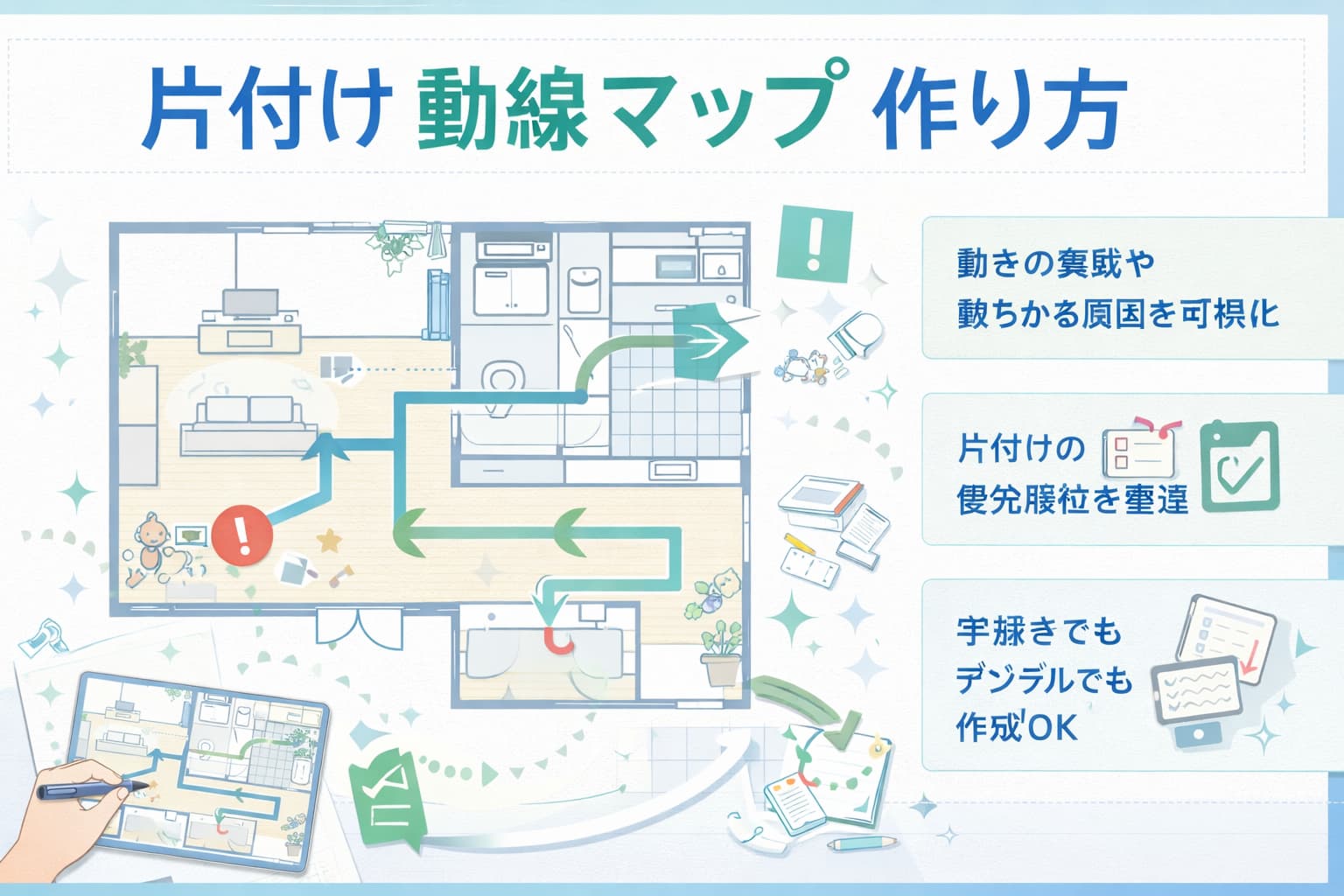 動線マップを使い、片付けの優先順序や動作の順番を整理すると、作業が明確になり、片付け中の迷いや悩みを減らせます。